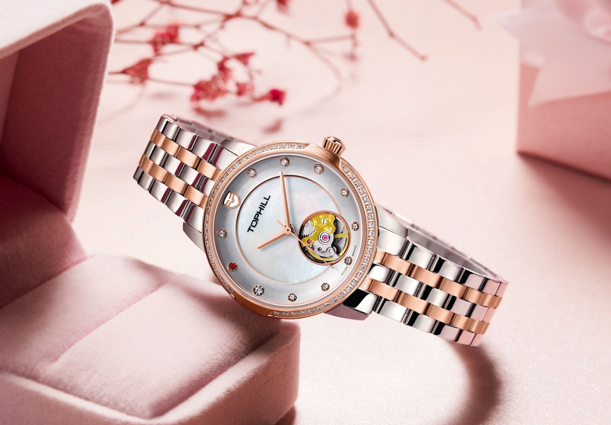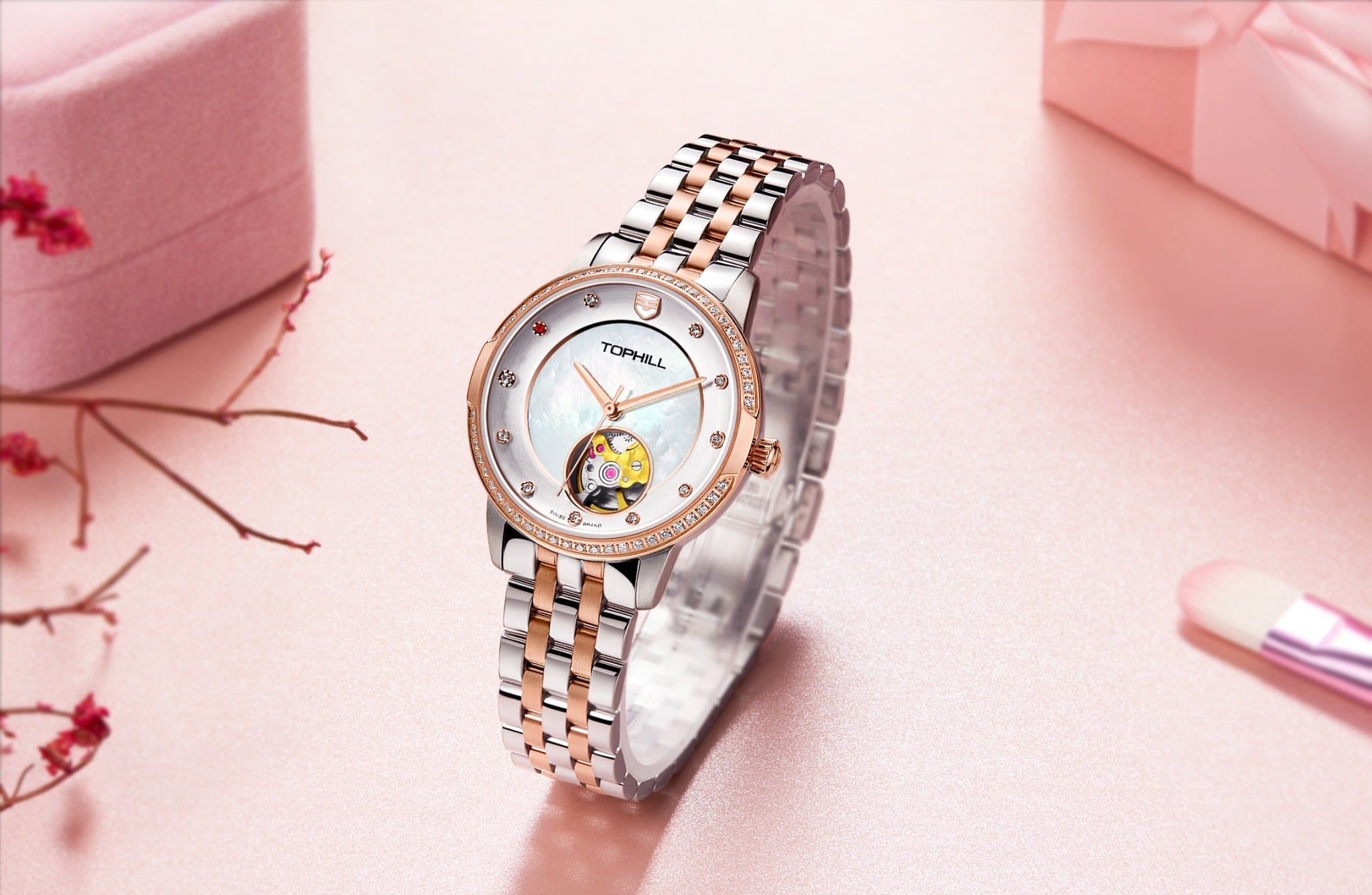 ĐỒNG HỒ TOPHILL TE035L.M7238 Nữ dây Thép 316L máy Automatic kính Sapphire Size 31mm 5ATM